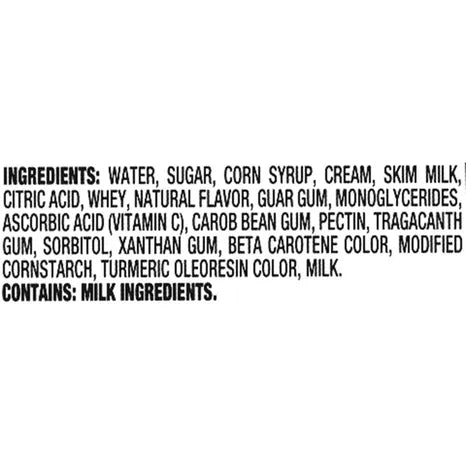WATER, SUGAR, CORN SYRUP, CREAM, MILK, CITRIC ACID, WHEY, GUAR GUM, NATURAL FLAVOR, ASCORBIC ACID (VITAMIN C), MONO AND DIGLYCERIDES, TRAGACANTH GUM, CAROB BEAN GUM, POLYSORBATE 80, TURMERIC OLEORESIN COLOR, GUM ARABIC, PECTIN, MODIFIED CORN STARCH, XANTHAN GUM, ISOMALT, DEXTROSE, BETA CAROTENE COLOR, CORN STARCH.